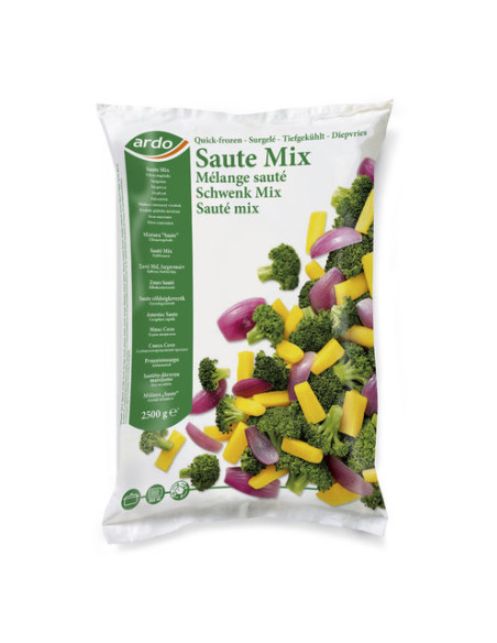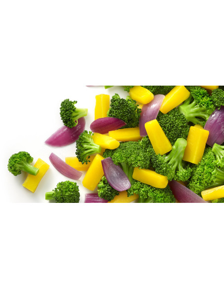 Mescla de verdures amb bròquil florets, pastanaga groga al tall rústic i ceba morada.