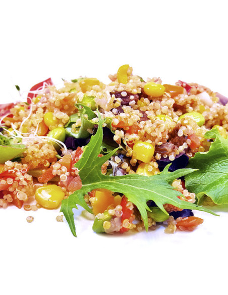 Quinoa cocida, haba de soja, maíz dulce, zanahoria, pimiento naranja, pimiento rojo.