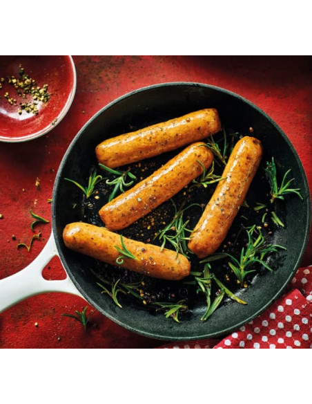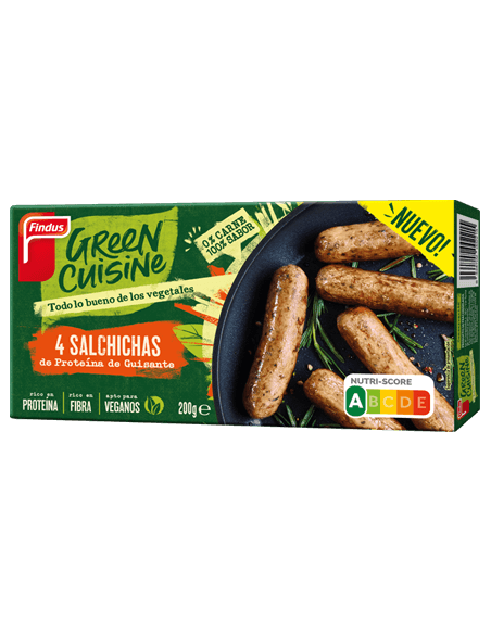 Inicio Salchicha 0% Carne Findus 09040910 Agua, proteína de guisante rehidratada (25%), aceite de nabina, cebolla, gluten de TRIGO, estabilizante: metilcelulosa, fibra de AVENA, almidón de patata, harina de guisante, aromas naturales, sal, fibra cítrica, fibra de psyllium, especias. Ver